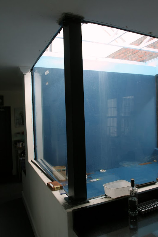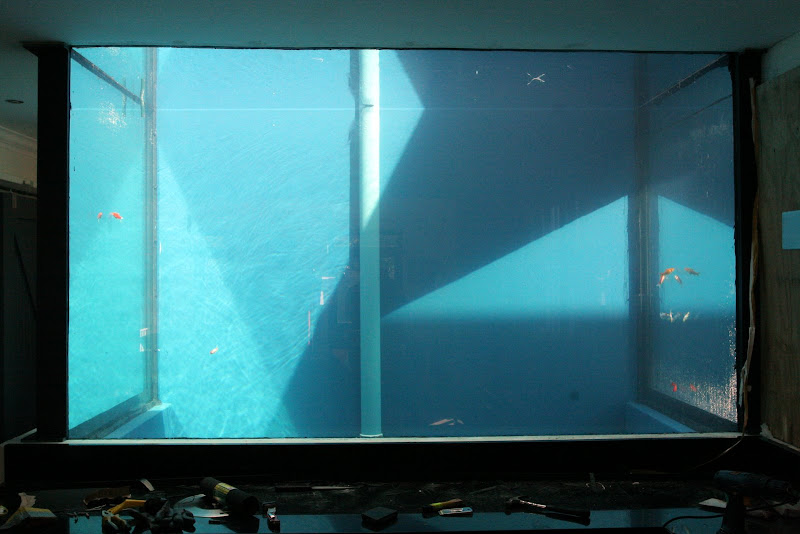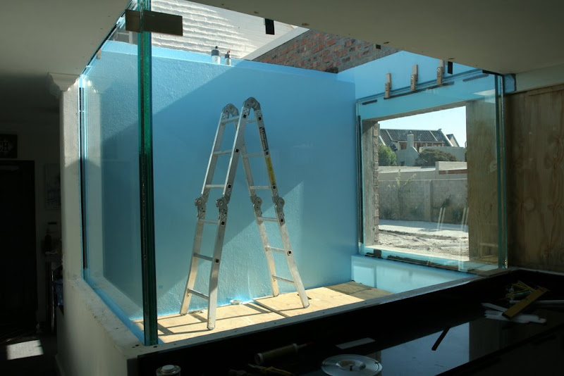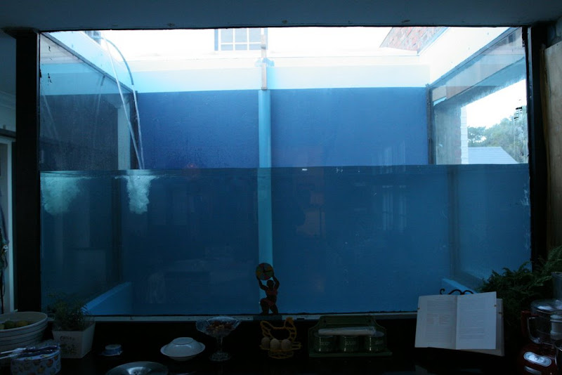Here are the pics. The house was more or less built around the tank. I'm trying not to be embarrassed about that: ![]() Here's the separate foundation being case for the tank: ![]() Originally, it was going to be made out of acrylic. The guy stole my (substantial) deposit, so I wound up doing it in glass instead: ![]() The front sheet is 71mm thick (just under 3 inches) and the side sheets are 58mm (just over 2 inches). Here's the rebar in the roof. The gap is where the tank goes :![]() A little further on: And enclosed: Piping to the greenhouse going in: Finally getting the acid wash (pre epoxy) in: